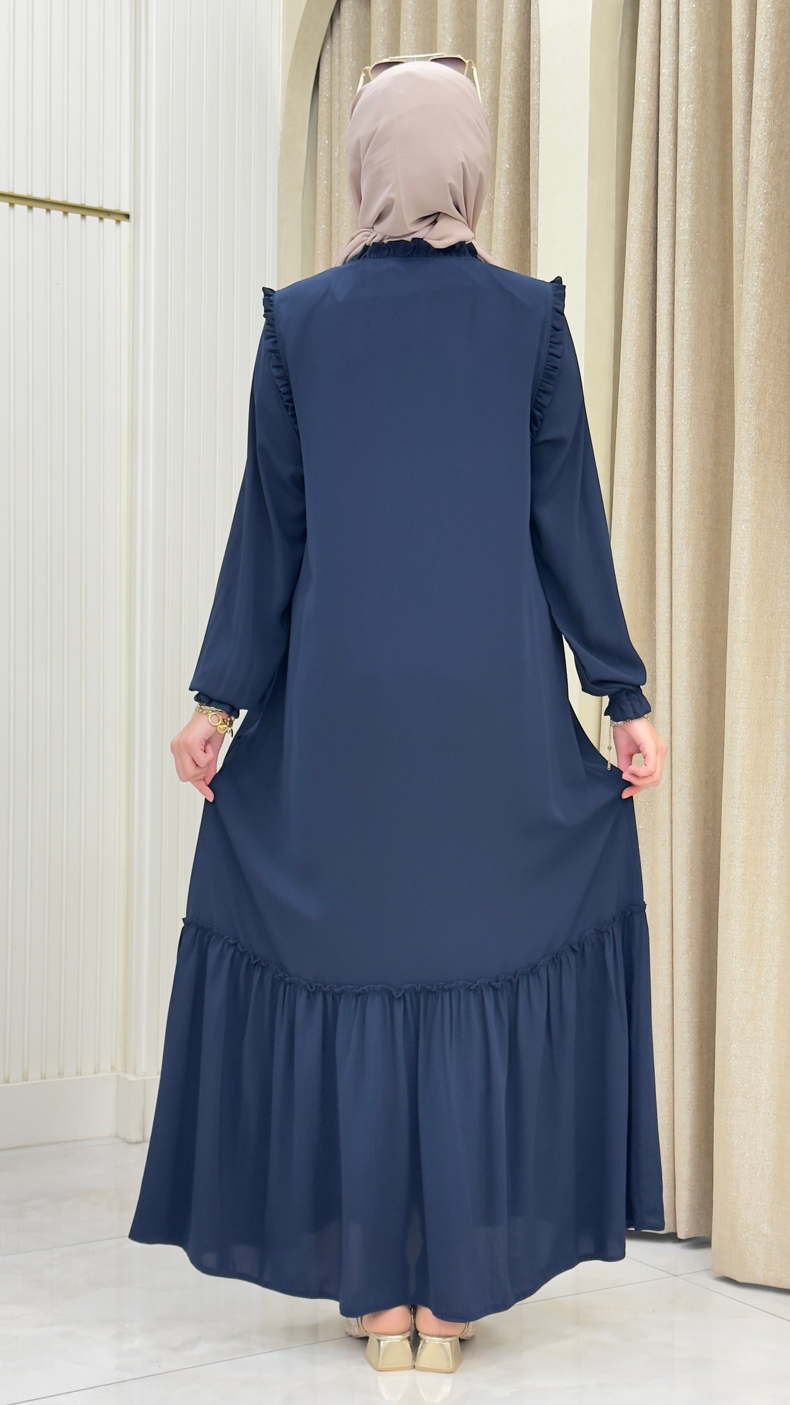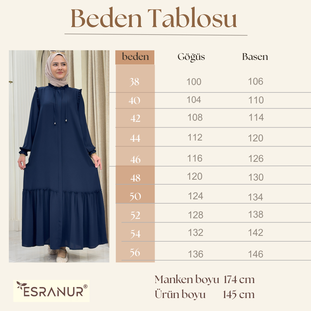 - Eteği fırfırlı silueti ile zarif bir görünüm kazandırırken, düz deseniyle sadelikten yana olanları memnun eder